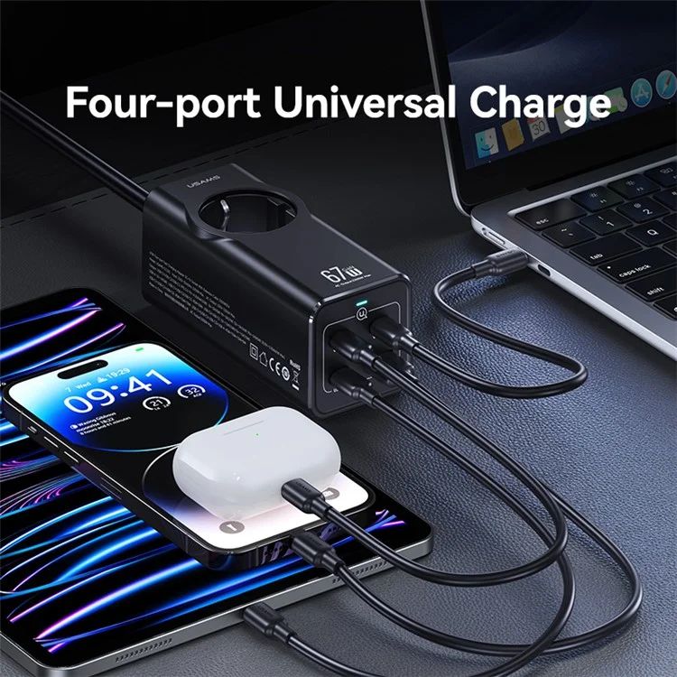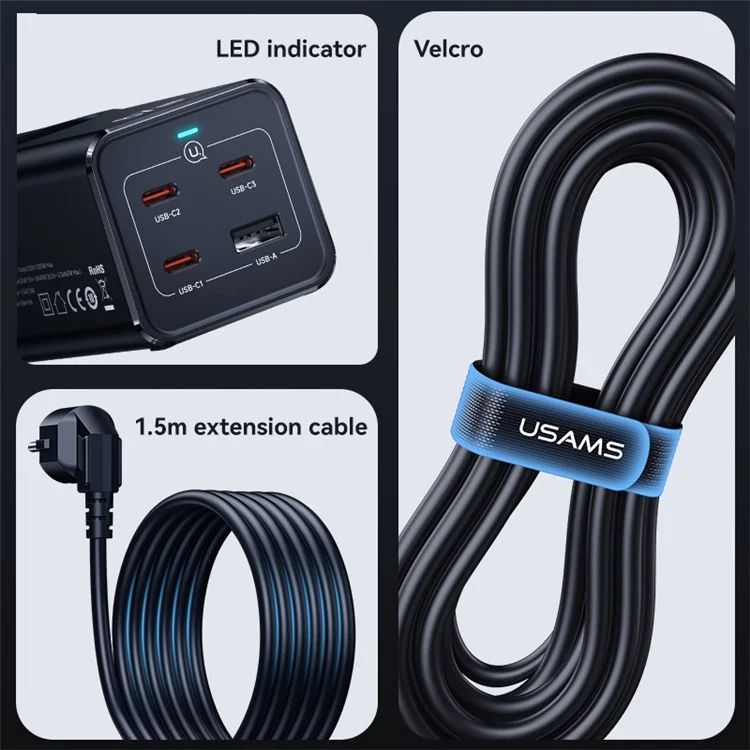 Hình Ảnh Bộ Sạc Nhanh Tích Hợp Dây Nguồn Nối Dài USAMS CC225 67W 4-port Fast Charging Adapter 3 Type-C+1 USB 2200W