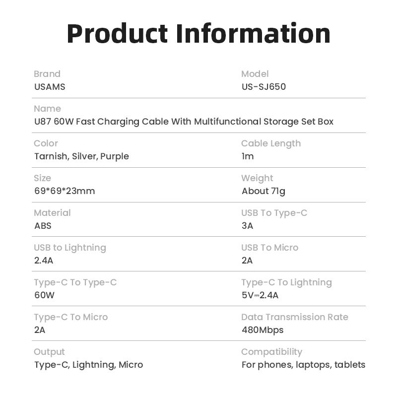 Chi Tiết Sản Phẩm Cáp Sạc Dây Rút Đa Năng USAMS SJ650 U87 60W (Tích Hợp Bộ Đầu chuyển )
