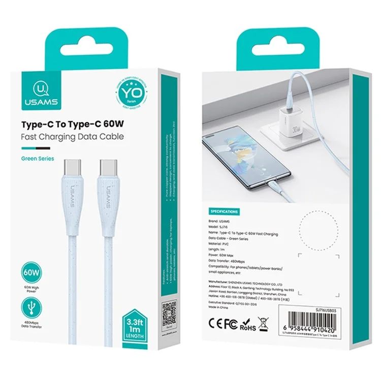 Giới thiệu Cáp Sạc Nhanh Type C USAMS SJ716 Green Series 1m 60W