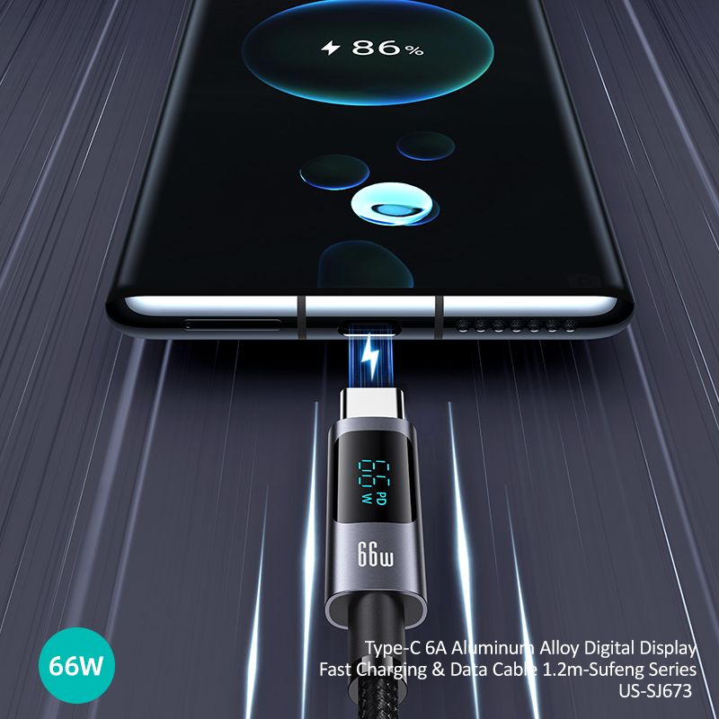 Cáp sạc USAMS SJ673 hỗ trợ sạc nhanh lên đến 66W, giúp sạc đầy pin thiết bị của bạn trong thời gian ngắn kỷ lục. Ví dụ, với điện thoại Huawei, bạn có thể sạc lên đến 86% pin chỉ trong 30 phút. Màn hình hiển thị kỹ thuật số trên cáp cho phép bạn theo dõi công suất sạc theo thời gian thực, vô cùng tiện lợi. Bạn sẽ không còn phải lo lắng về việc sạc pin chậm chạp hay không biết thiết bị đang được sạc với công suất bao nhiêu.