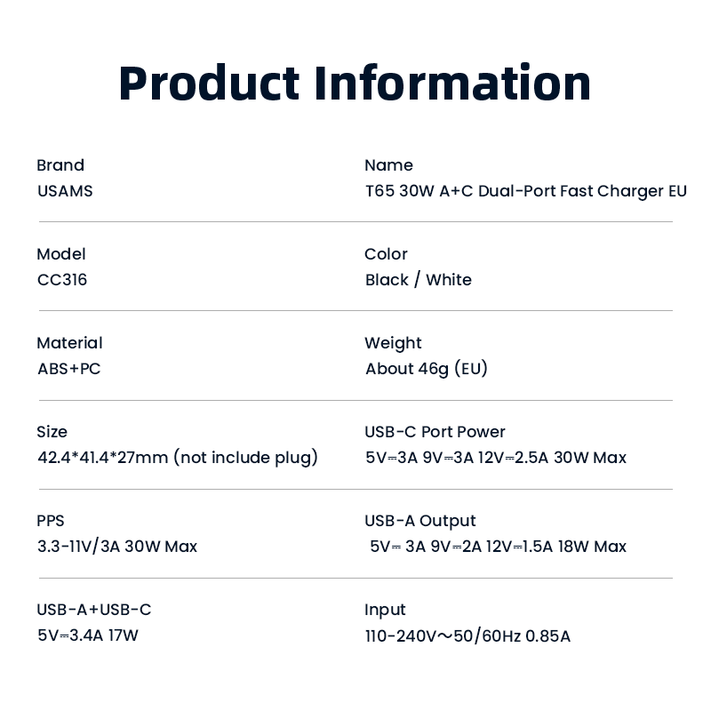 Củ sạc USAMS CC316 nổi bật với khả năng cung cấp công suất sạc lên đến 30W. Điều này có nghĩa là thiết bị của bạn sẽ được sạc đầy pin trong thời gian ngắn hơn đáng kể, giúp bạn tiết kiệm thời gian chờ đợi.