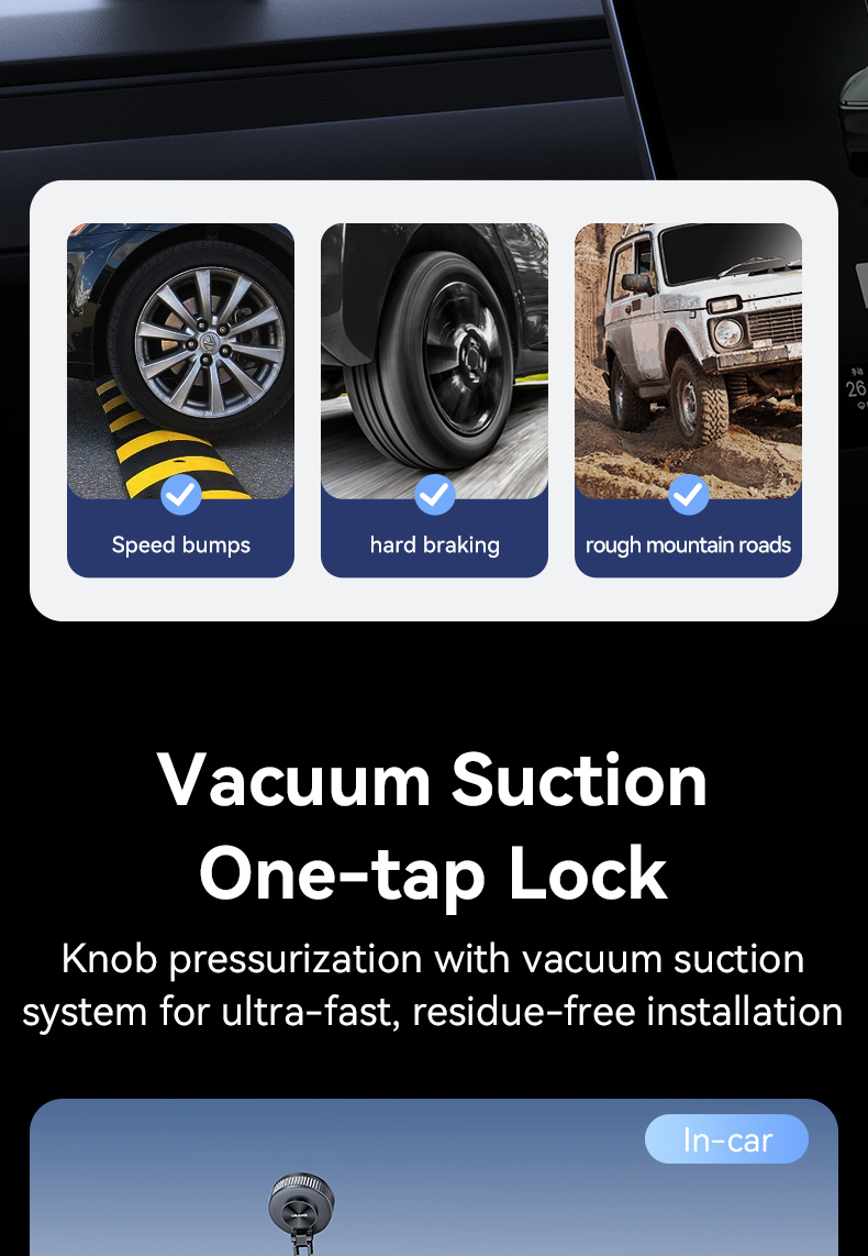- Bám dính cực mạnh: Chỉ cần một nút bấm (one-touch locking), đế hút sẽ tạo ra lực bám cực chắc lên các bề mặt phẳng và nhẵn như: kính lái, taplo ô tô, màn hình điều khiển trung tâm, mặt bàn kính, gạch men nhà bếp...