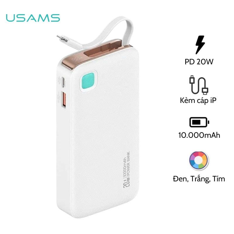 Giới thiệu Pin Dự Phòng Tích Hợp Cáp Dây Rút Lightning USAMS CD225 10000mAh 20W (LED Display)