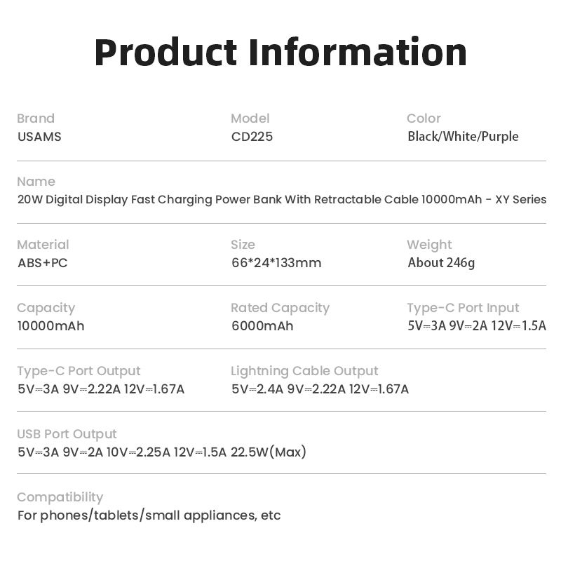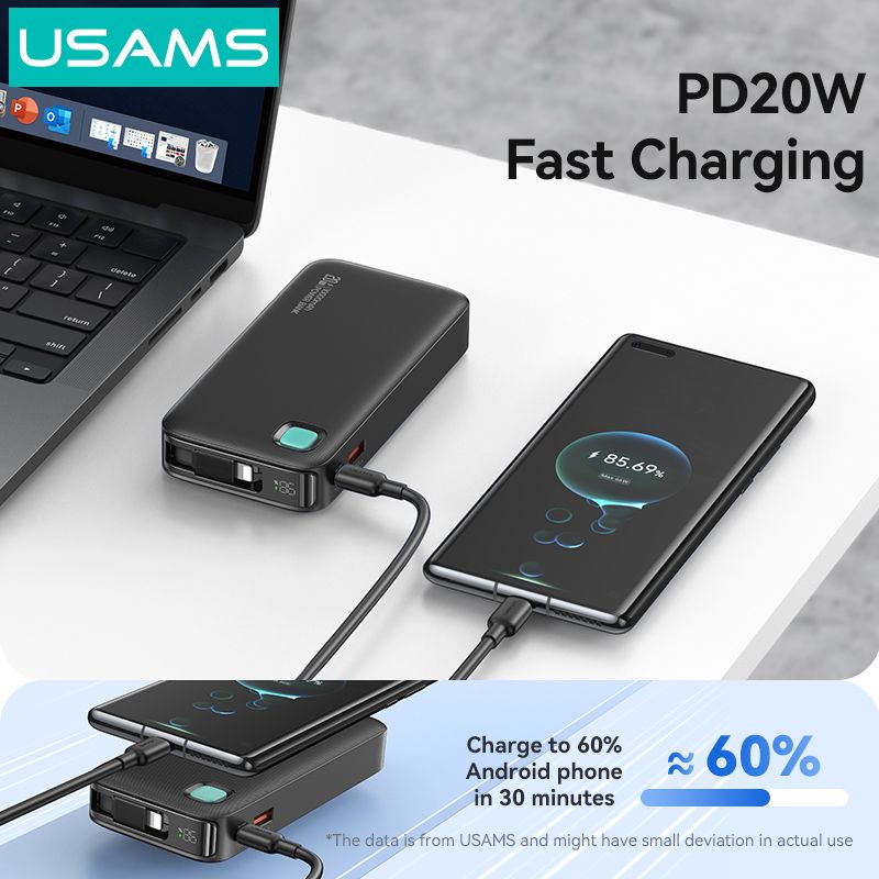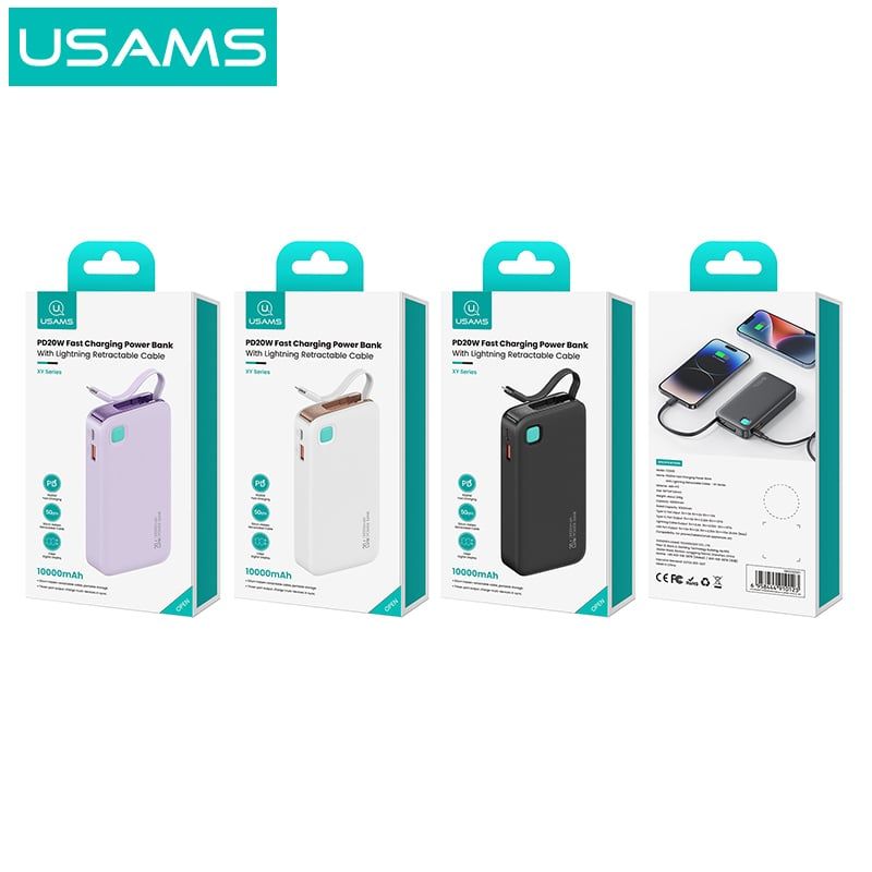 Hình Ảnh Pin Dự Phòng Tích Hợp Cáp Dây Rút Lightning USAMS CD225 10000mAh 20W (LED Display)