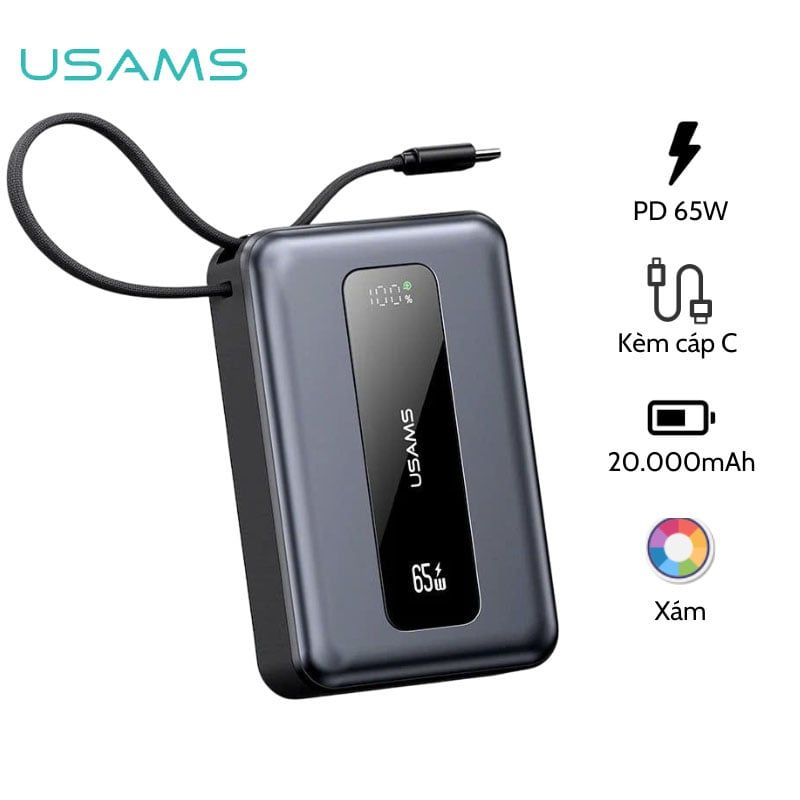 Pin Dự Phòng USAMS CD243 20000mAh 65W (Digital Display, 3-Port, With Built-in Type-C Cable, 3C Certification)