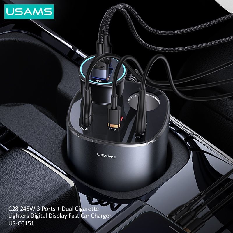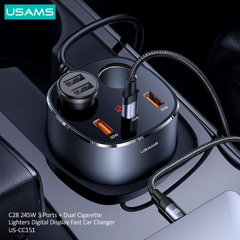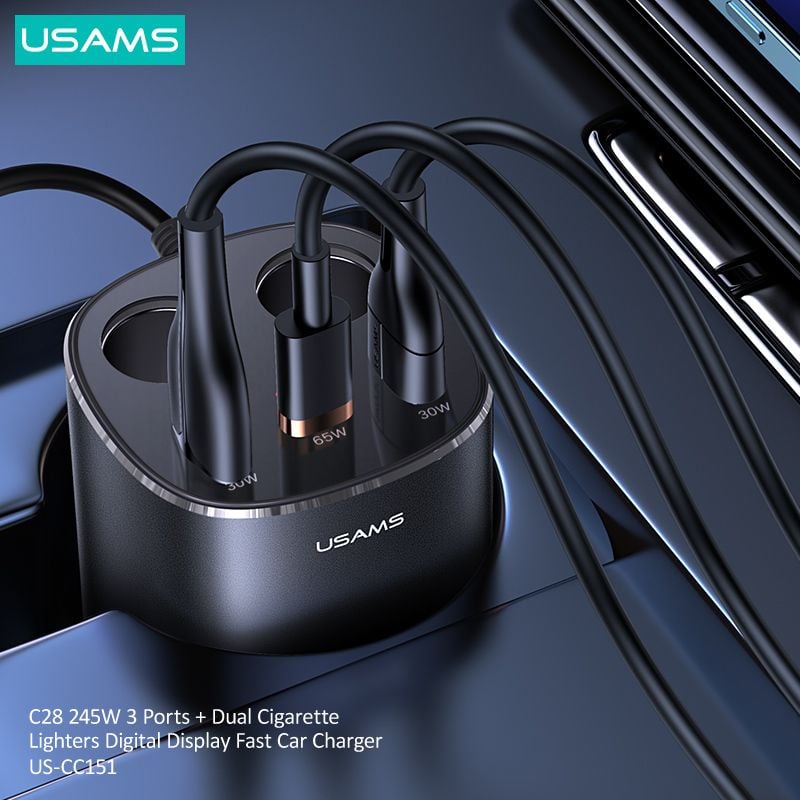 Tẩu Sạc Cho Ô Tô C+2A+2 Tẩu Nối Dài USAMS CC151 C28 245W (Digital Display Voltage)