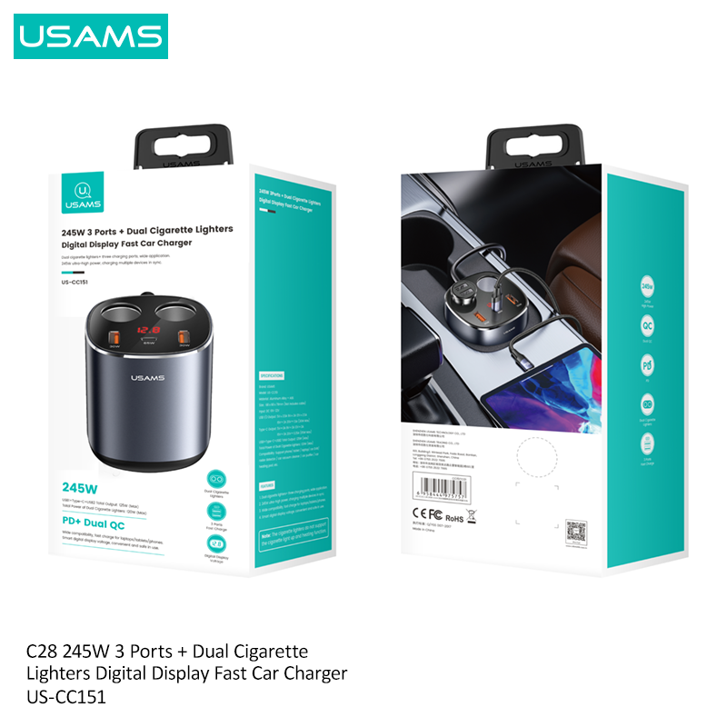 Tính năng Tẩu Sạc Cho Ô Tô C+2A+2 Tẩu Nối Dài USAMS CC151 C28 245W (Digital Display Voltage)