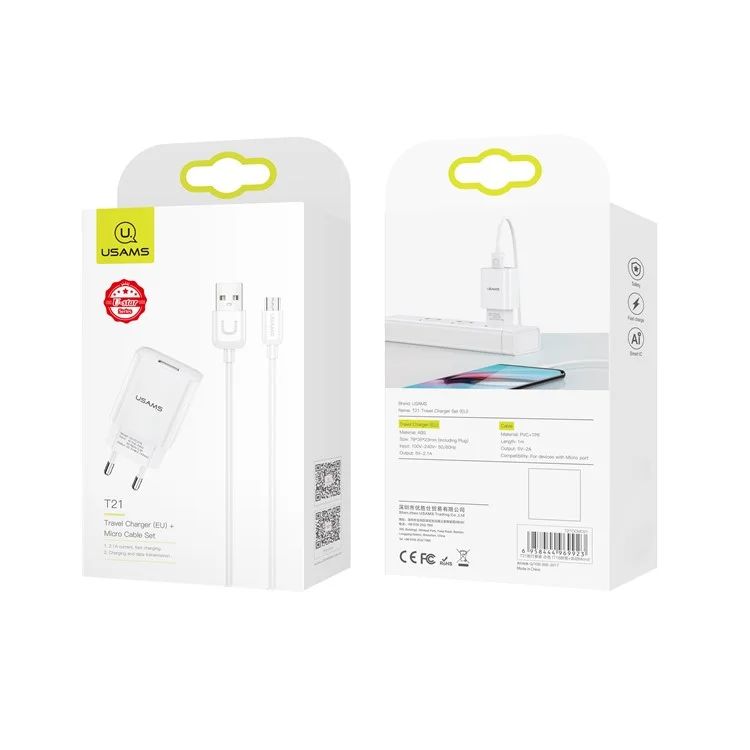 Combo củ cáp sạc USAMS T21 Travel Charger Set 2.1A Wall Phone Charger and Micro USB Cable (EU Plug)